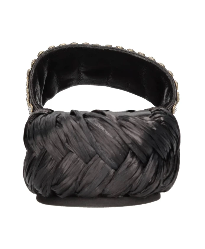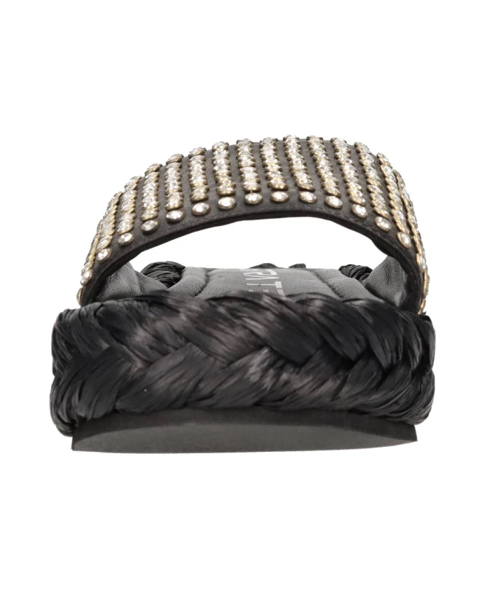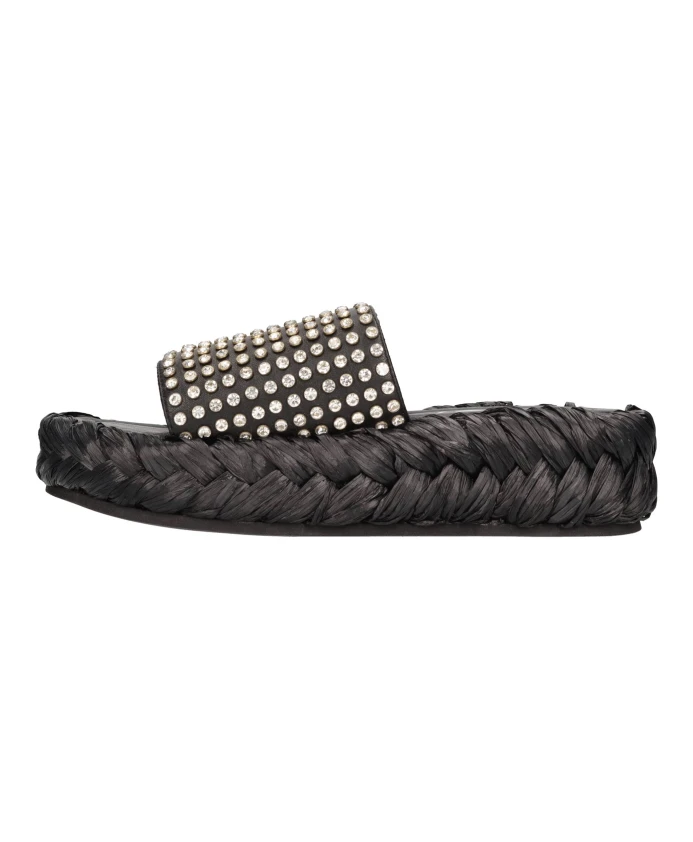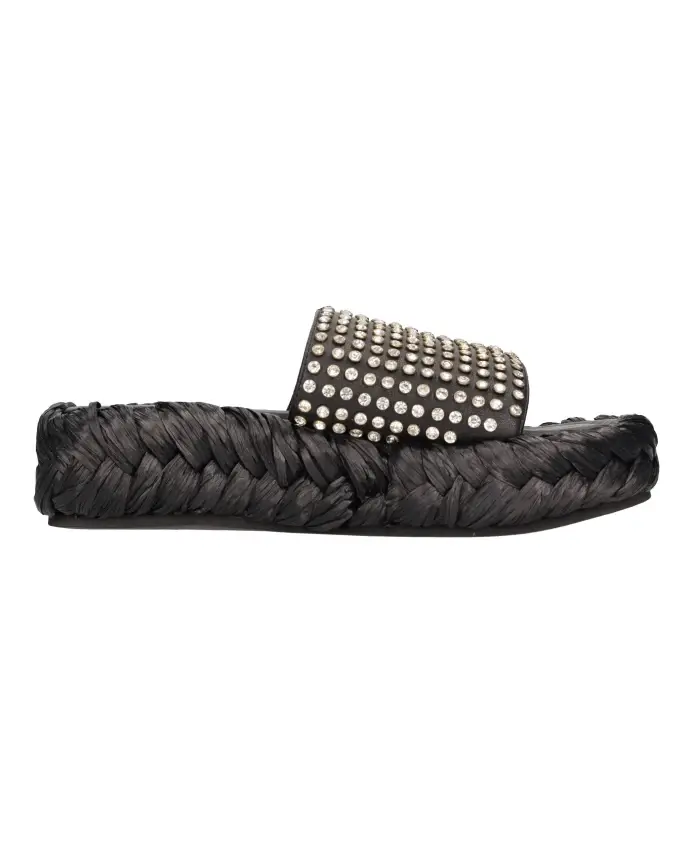 Подчеркните свой летний стиль с помощью этих шлепанцев Strategia. Изготовленные из кожи и украшенные стразами, эти мюли имеют резиновую подошву и отделку из рафии для комфорта. Идеальный вариант для модниц.