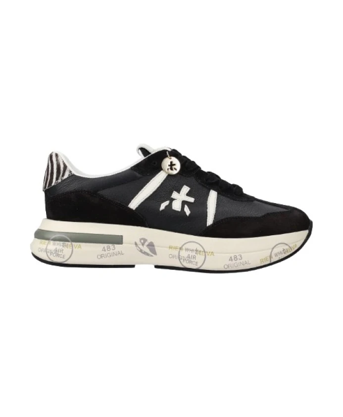 Подчеркните свой стиль с помощью этих черно-белых женских кроссовок Premiata. Эти кроссовки с боковым логотипом, зебровым рисунком на пятке и фирменной подошвой отличаются смелым и оригинальным дизайном.
