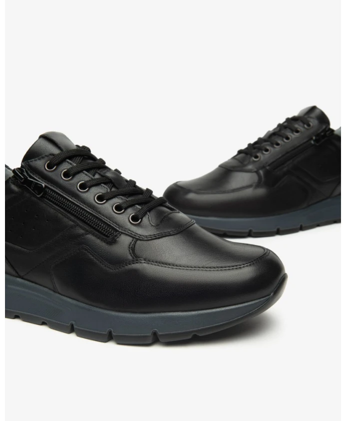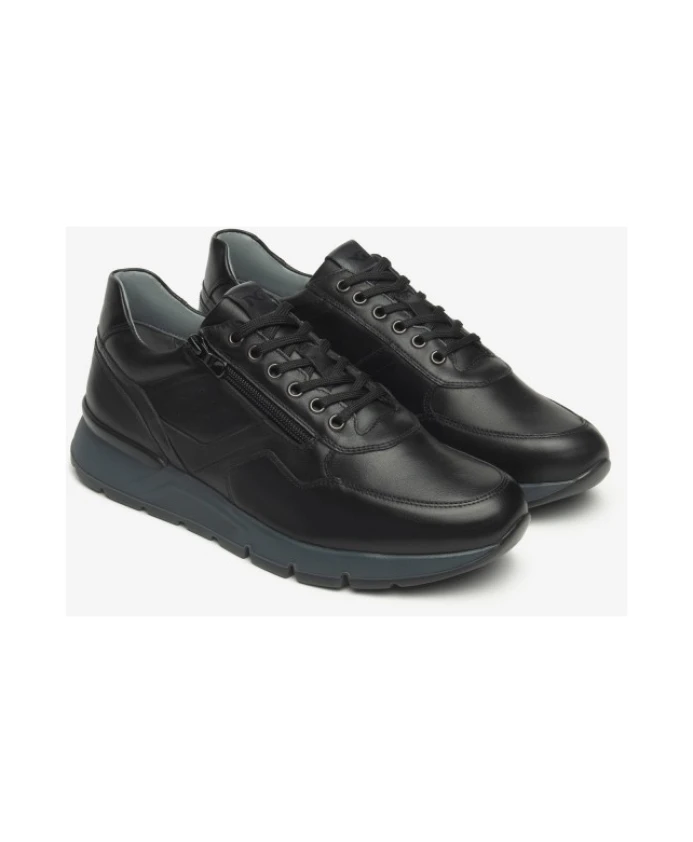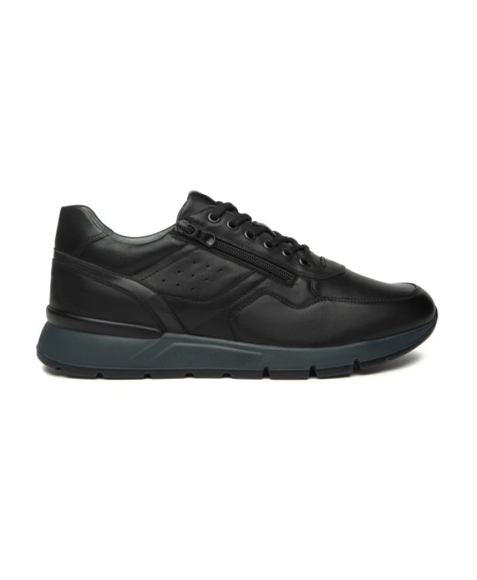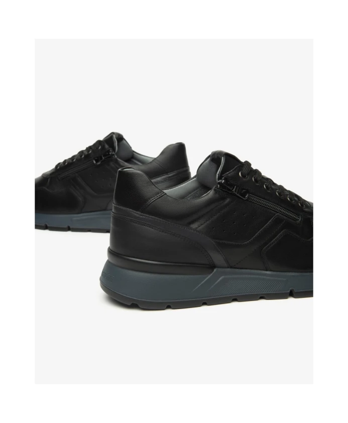 Мужские кожаные кроссовки Nerogiardini со шнуровкой и молнией для удобства надевания и снимания. Съемная стелька из пеноматериала с эффектом памяти на резиновой подошве высотой 4,5 см. Сделано в Италии.
