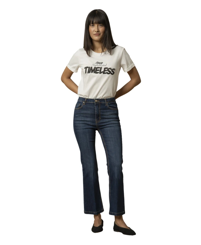 Стильные, свободные джинсы полной длины с едва заметными вертикальными полосками сверху, зауженным кроем, стандартными карманами и застежкой на хромированную пуговицу. Рост модели 175 см, размер S/42.