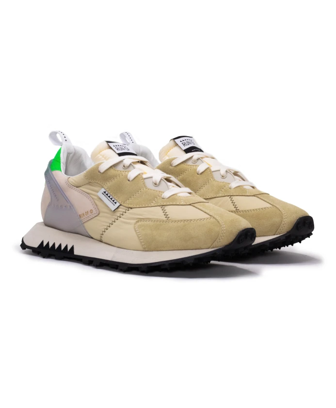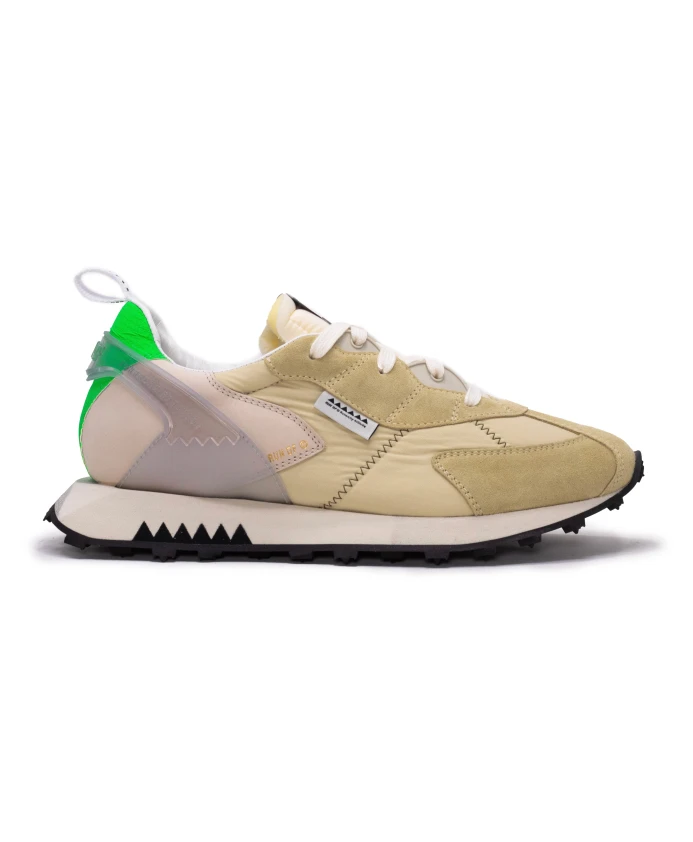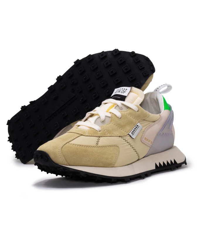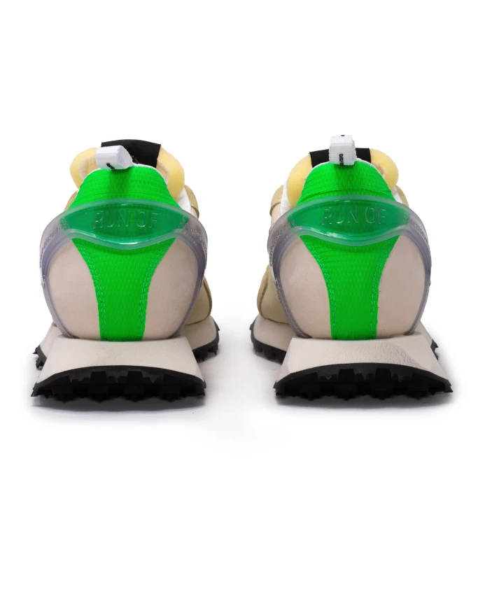 Кроссовки цвета SABBIA, изготовленные из натуральной кожи и синтетической ткани, с зеленой флуоресцентной вставкой на пятке, хлопковыми шнурками и бело-черной резиновой подошвой. Сделано в Италии.