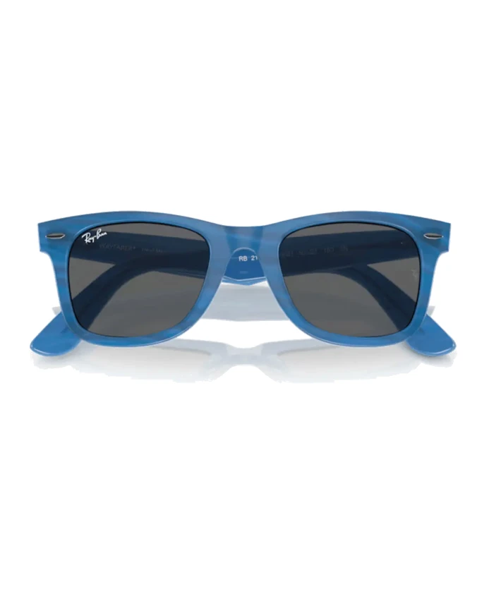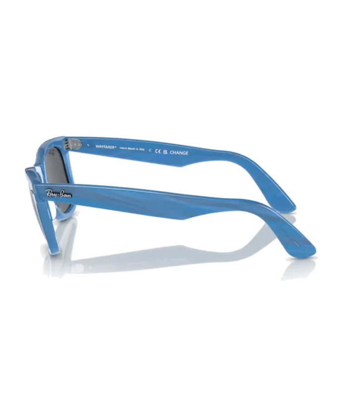 Подчеркните свой стиль с помощью солнцезащитных очков Ray-Ban Wayfarer RB2140 1409B1 в полосатой синей оправе. Оправа выполнена из фотохромного ацетата в полоску синего цвета, линзы - темно-серые.