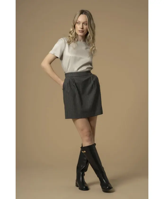 Профессиональная юбка миди из капсульной коллекции Pure Verve, украшенная едва заметными полосками, двойной строчкой на поясе и подоле, а также мягкими складками. Рост модели 175 см, размер S/42.