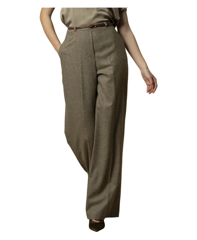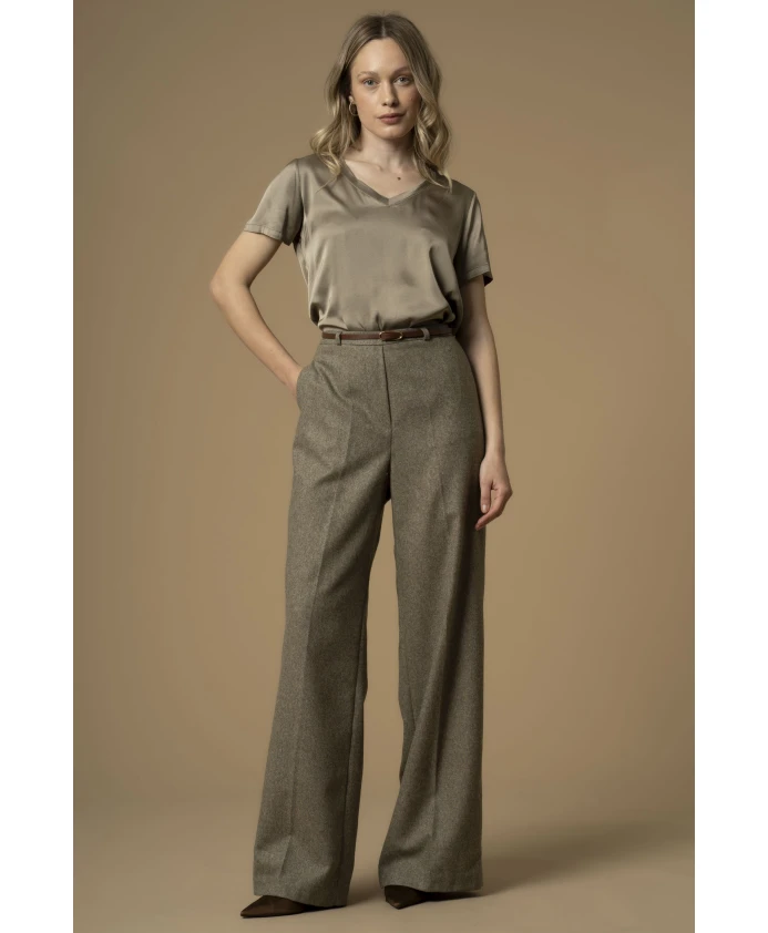 Универсальные длинные брюки, слегка складки на штанинах, свободный крой, надеваются поверх сапог, ребристый пояс и нижний край, контрастный узкий пояс с пряжкой. Рост модели 175 см, размер S/42.