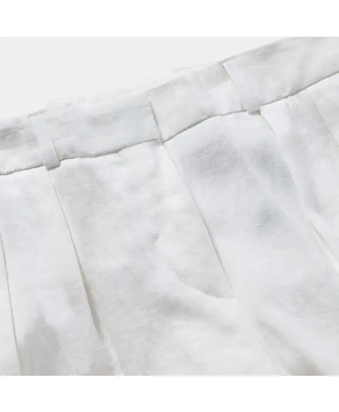 Брюки-«бульдог»; Крой: Обычный; Особенности: Широкие штанины, складки на талии, складки спереди; Талия: Высокая; Застежка: Молния с крючком; Материал: 100% ирландский лен; Сделано в: Марокко.