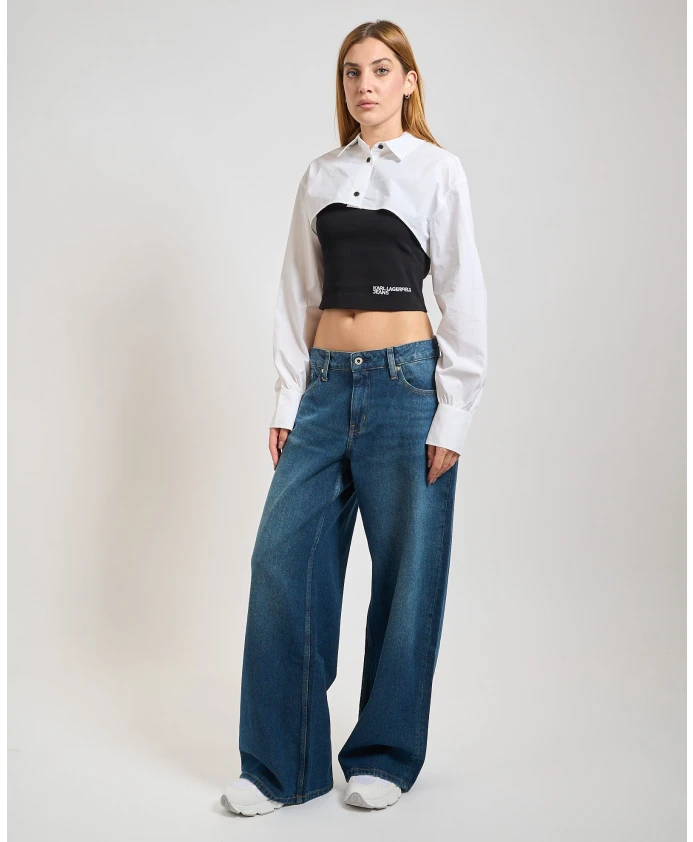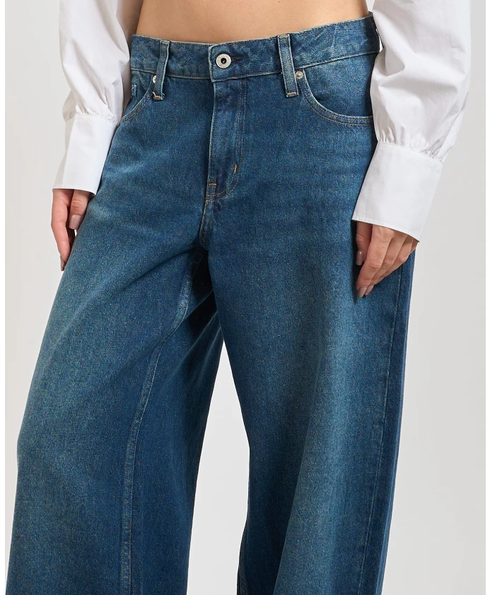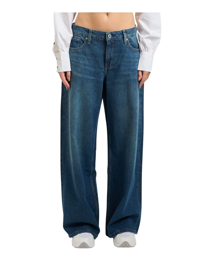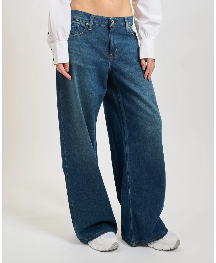Женские джинсы Karl Lagerfeld с широкими штанинами, низкой посадкой и свободным кроем, фирменной пуговицей и отворотом на клапане. Модель носит размер 26 (американский) и имеет рост 170 см.