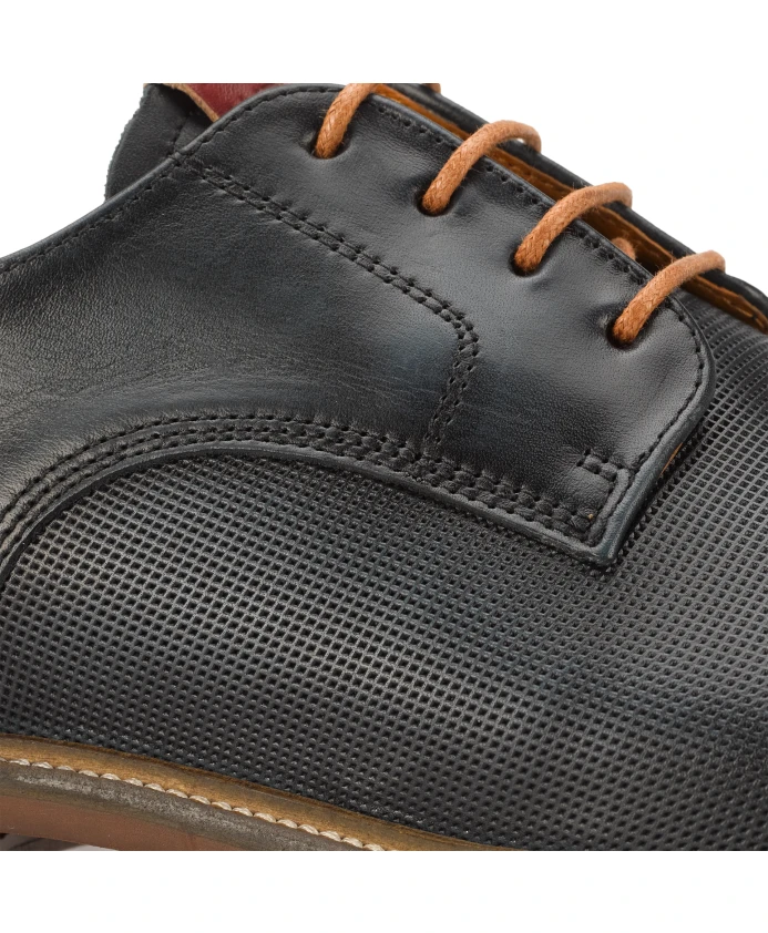 Туфли-дерби с верхом из комбинированной кожи и перфорированной кожи. Легкая термопластичная подошва и полностью кожаная подкладка. Повседневная обувь с характерным внешним видом и стилем.