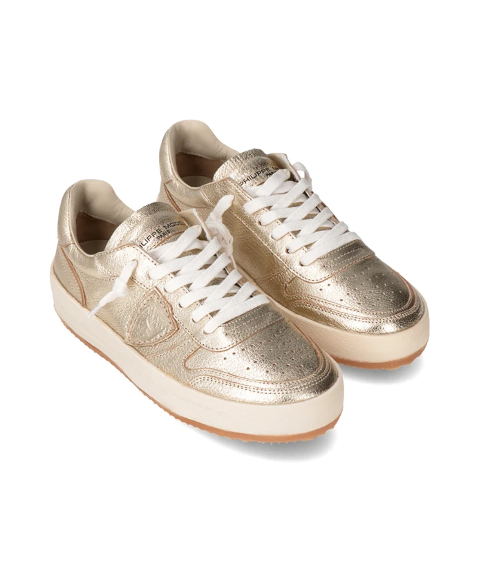 Кроссовки из телячьей кожи с ламинированным золотистым покрытием. Мягкая съемная стелька, дышащая подкладка из вспененного хлопка. Ремешок и персонализированный логотип на подошве.