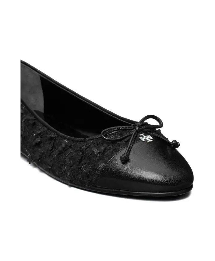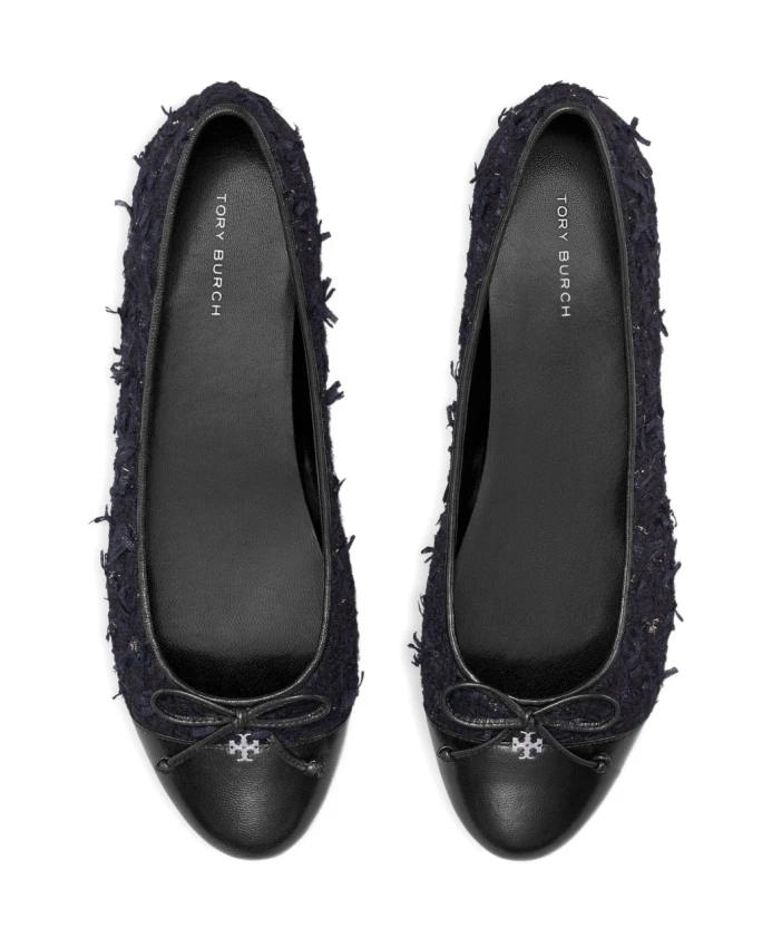Подчеркните свой стиль с помощью этих темно-синих твидовых балеток Tory Burch с кожаным носком, бантом, металлизированной нитью и плоской подошвой. Идеальный вариант для модницы.