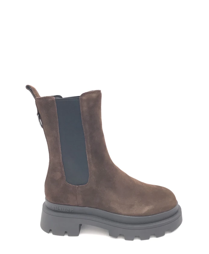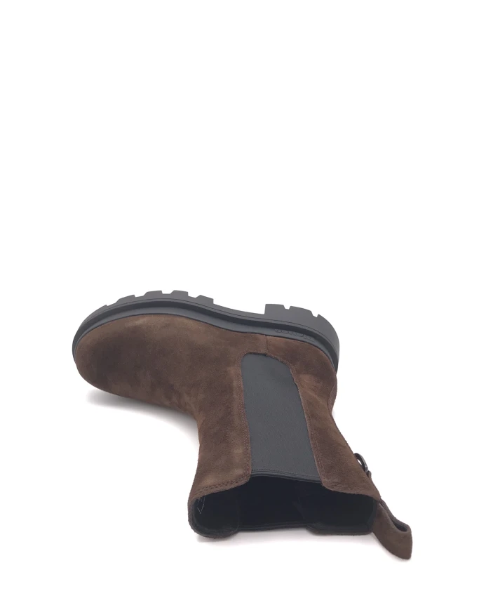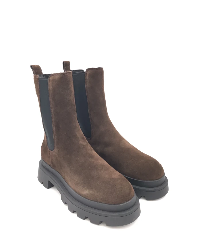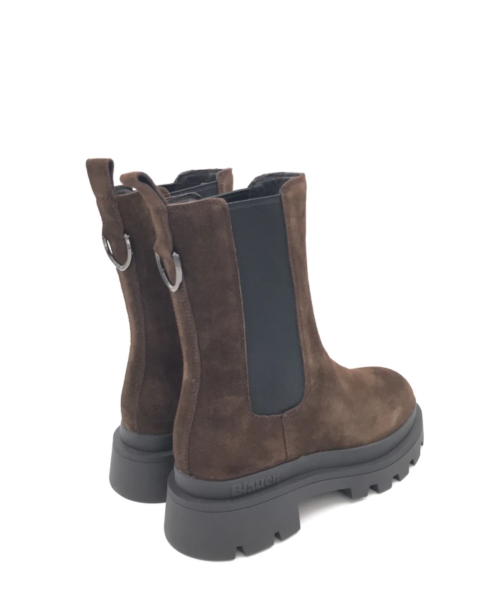 Женские синие ботинки челси из темно-коричневой замши. С эластичными боковыми вставками, закругленным носком, кожаной подкладкой и массивной резиновой подошвой, пришитой к верху.