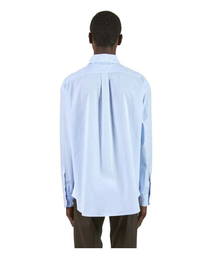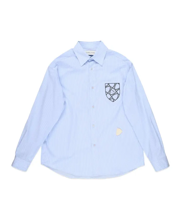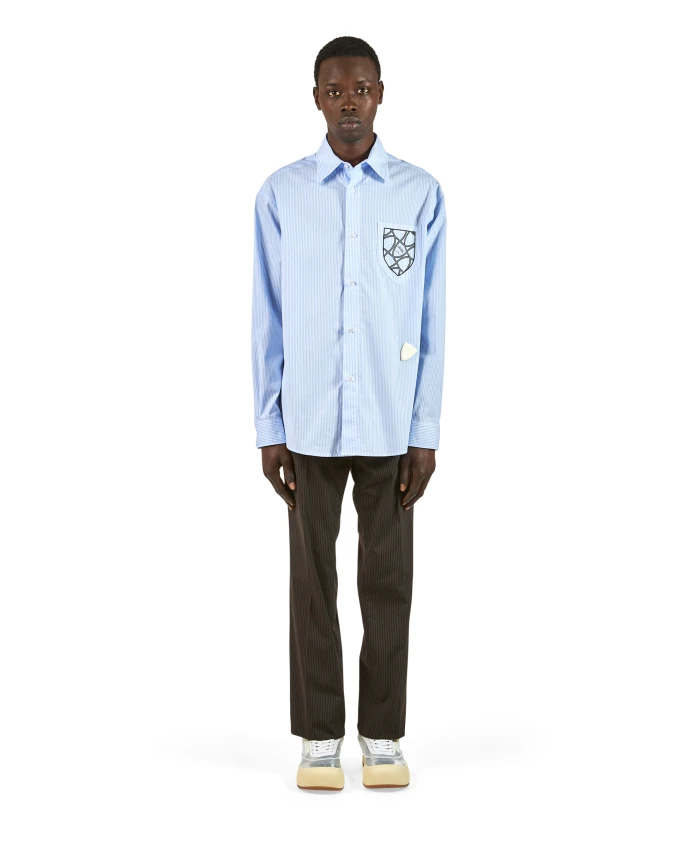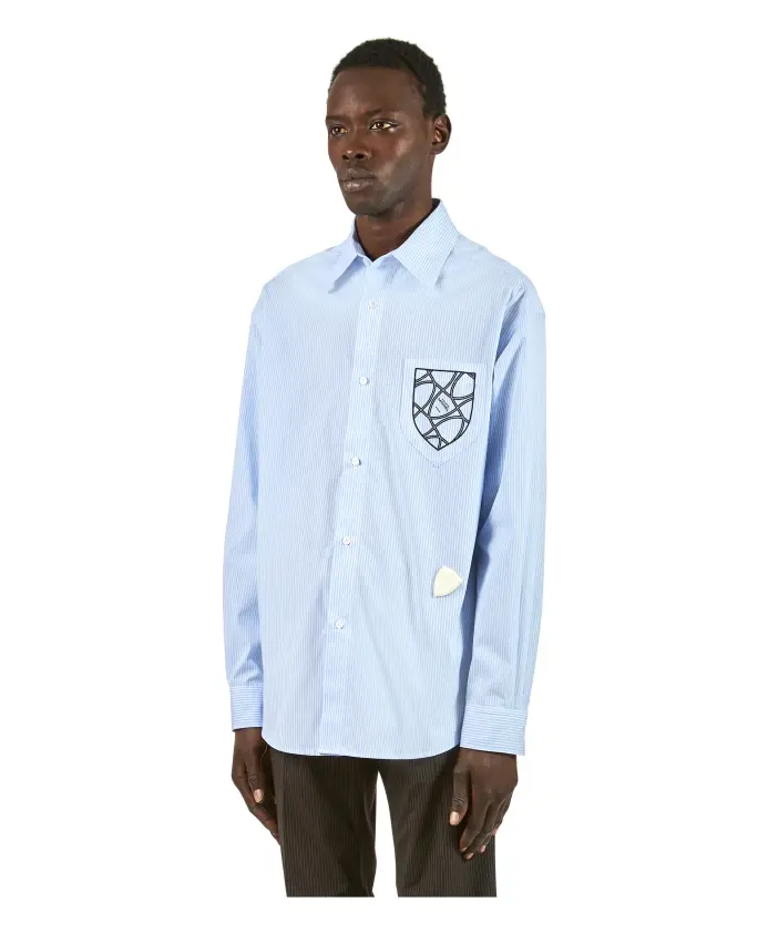 Полосатая рубашка из чистого хлопкового поплина свободного кроя с накладным карманом, украшенная монограммой в виде щита. С левой стороны имеется резиновая нашивка в форме щита.