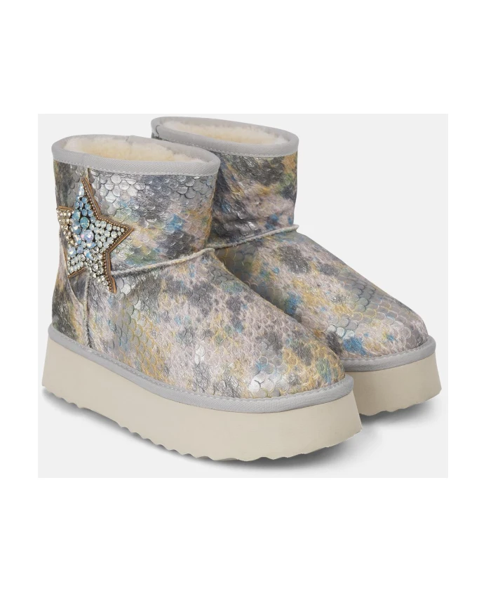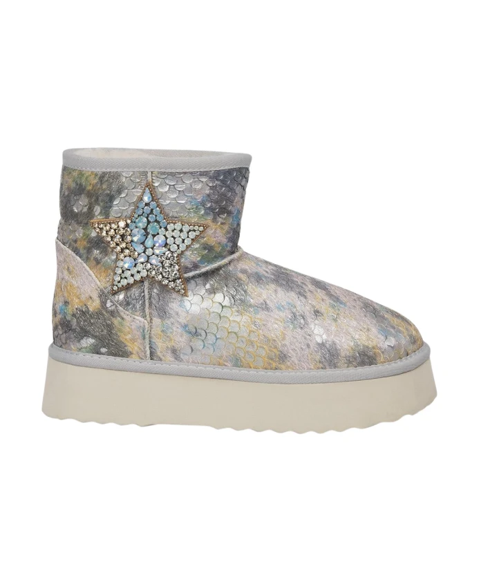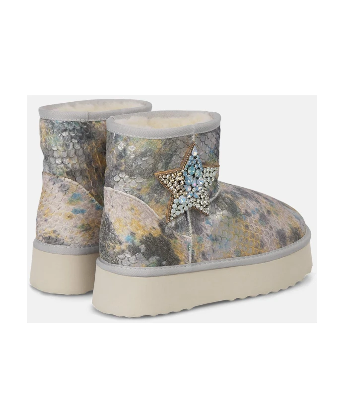 Женские меховые ботильоны с отделкой стразами. На правом ботильоне изображены звезда и луна. Закругленный носок, без застежки. Высота каблука: 3,5 см, высота голенища: 11 см.