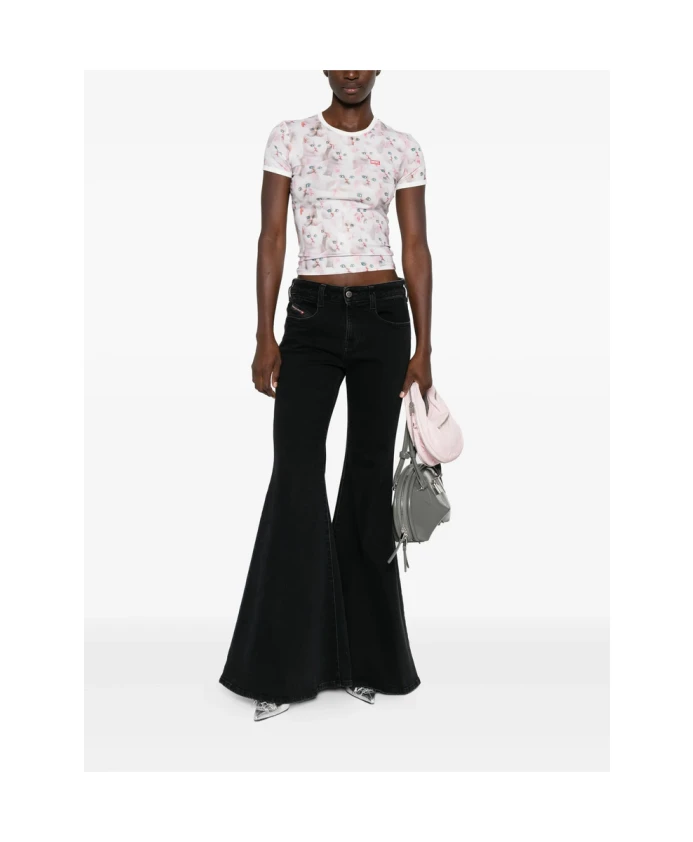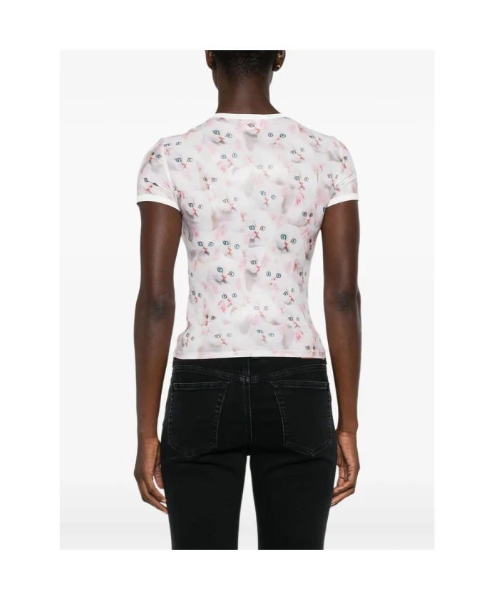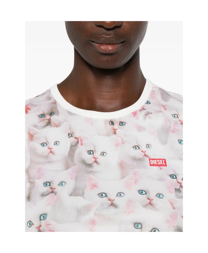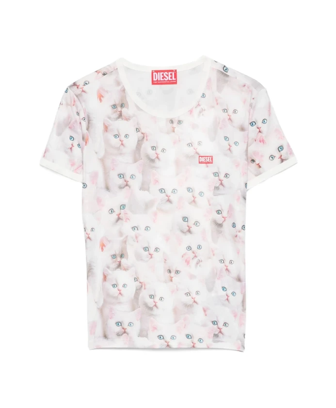 Оставайтесь стильной с этой белой футболкой Diesel с принтом в виде кошек по всей поверхности, круглым вырезом и короткими рукавами - идеальный вариант для модной женщины.