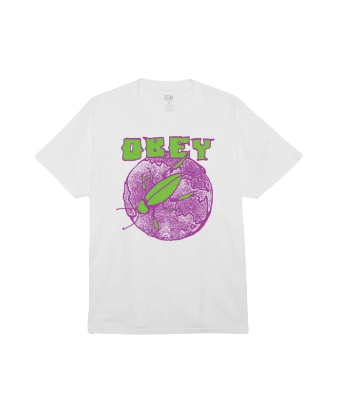Футболка унисекс Obey с круглым вырезом, контрастным принтом с логотипом спереди и сзади, короткими рукавами, стандартным кроем, белого цвета, изготовлена из 100% хлопка.