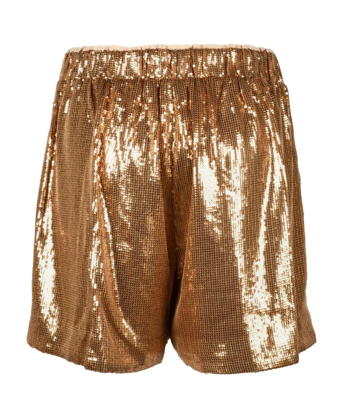Подчеркните свой стиль с помощью этих женских шорт-комплекта. Изготовлены из 100% полиэстера, украшены пайетками по всей поверхности, имеют карманы и эластичную застежку.