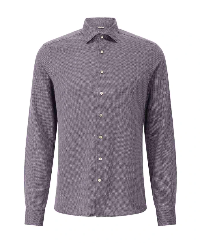 Эта приталенная рубашка из легкого хлопка отличается оригинальным узором, придающим ей современный и неповторимый вид. Облегающий крой выгодно подчеркивает фигуру и создает элегантный образ. Идеально подойдет тем, кто ищет стильную и удобную рубашку, подходящую как для повседневной носки, так и для особых случаев.