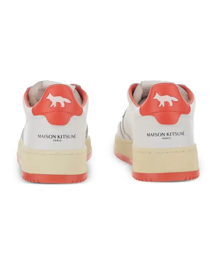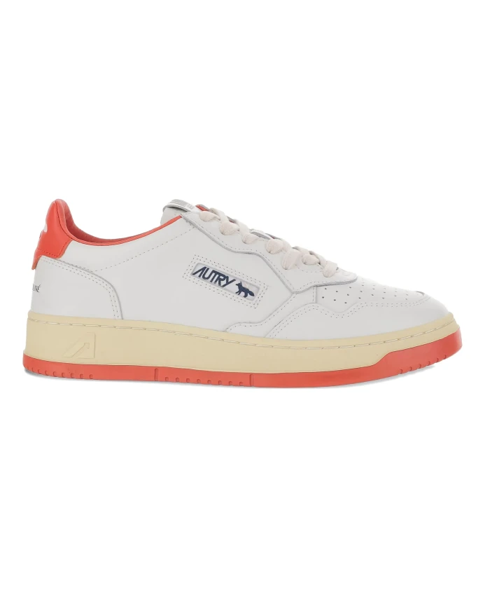 Мужские белые кожаные кроссовки Autry с перфорированным логотипом лисы на кожаном верхе, красным язычком и задником, кремовой межподошвой и красной внешней подошвой.