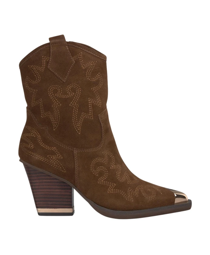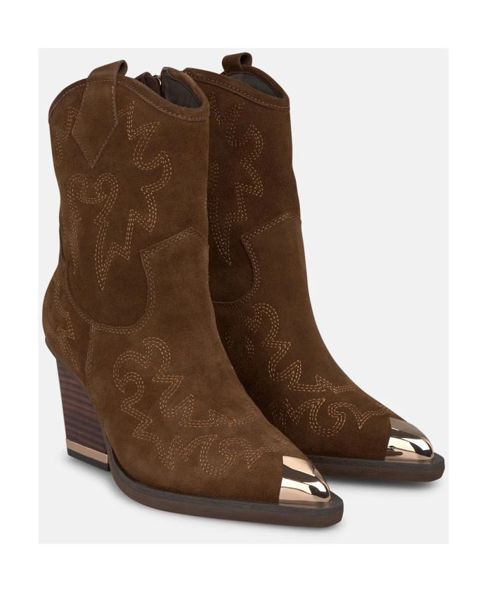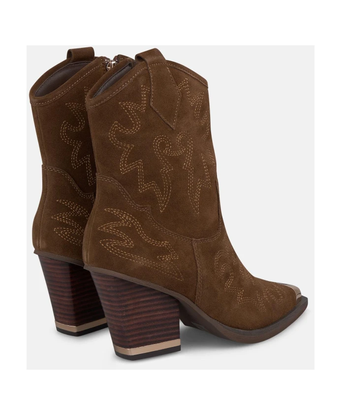 Женские ботильоны на каблуке в ковбойском стиле. Особенности: заостренный носок, широкий каблук и застежка-молния. Высота каблука: 8,5 см, высота голенища: 15 см.