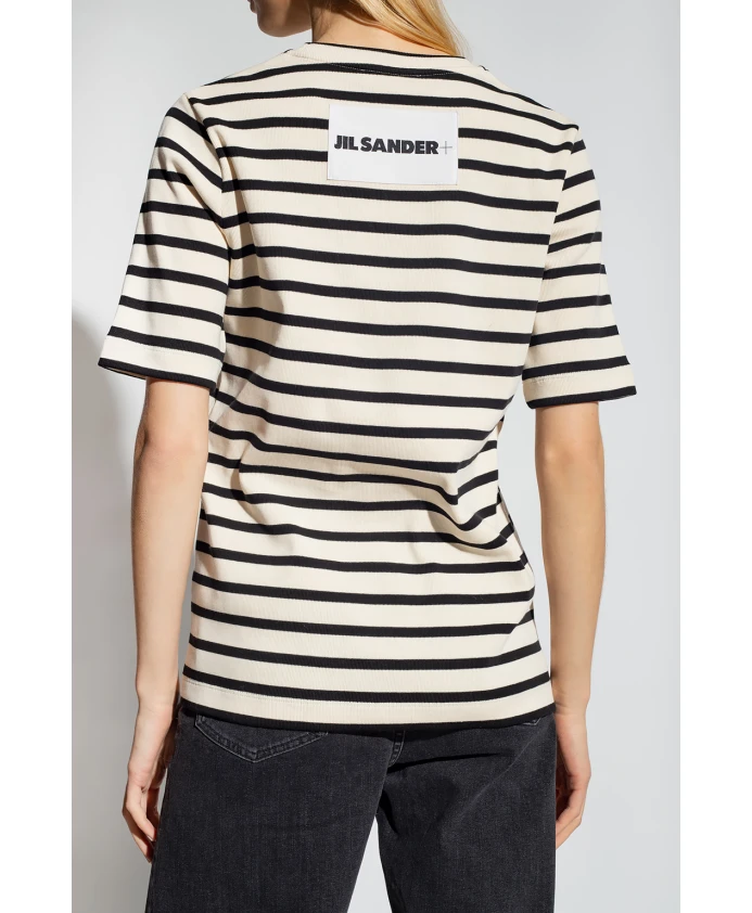 Футболка кремового и черного цвета от Jil Sander+. Изготовлена из хлопка, имеет короткие рукава, нашивку с логотипом на спине и ребристый круглый вырез горловины.