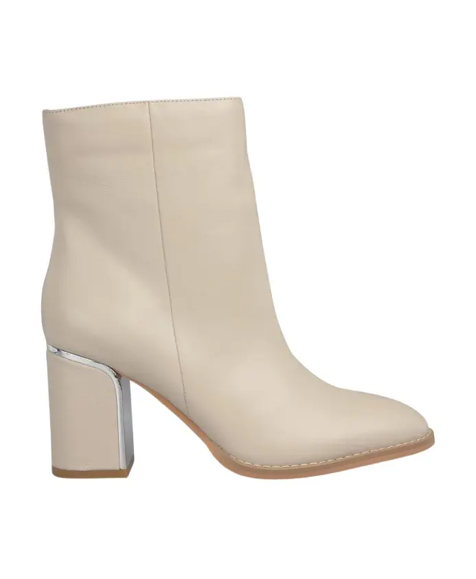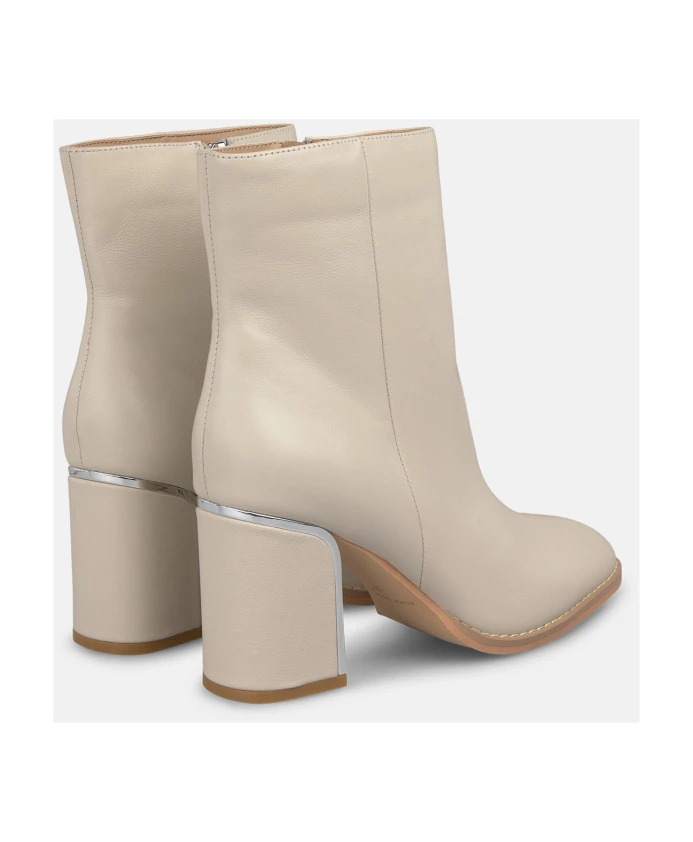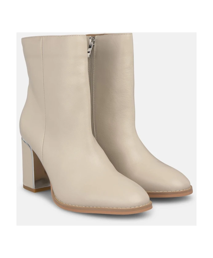 Женские ботильоны с металлизированной отделкой на каблуке. Имеют закругленный носок, широкий каблук и застежку-молнию. Высота каблука 8 см, длина голенища 14 см.