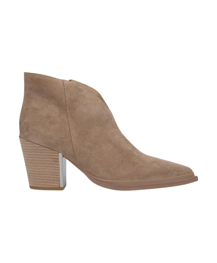 Женские ботильоны на каблуке с разрезом спереди. Особенности: заостренный носок, широкий каблук и застежка-молния. Высота каблука: 8 см, высота голенища: 14 см.