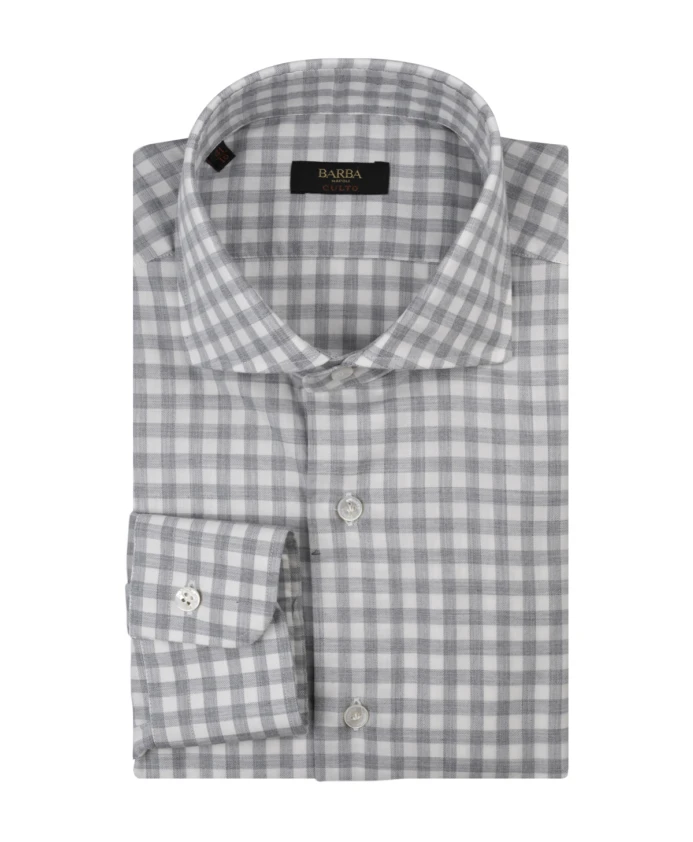 Белая хлопковая мужская рубашка Barba в серую клетку, доступна в различных размерах воротника. Идеально подходит для создания повседневного и стильного образа.