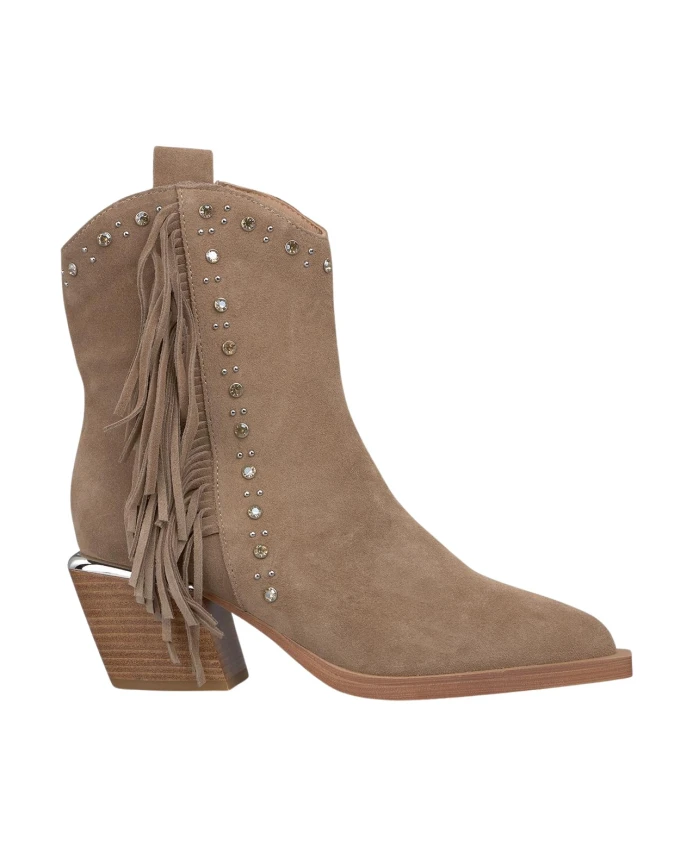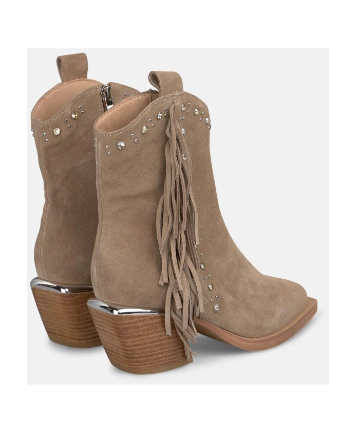 Женские ботильоны на каблуке с бахромой и стразами. Имеют заостренный носок, широкий каблук и застежку-молнию. Высота каблука 7 см, высота голенища 15 см.