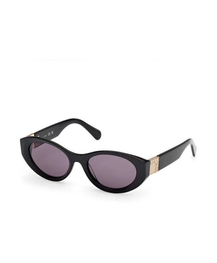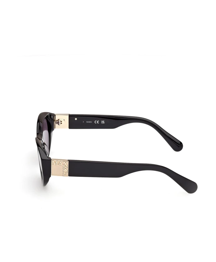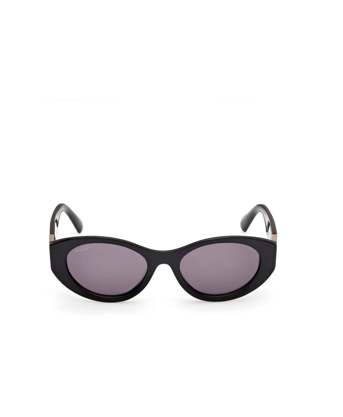 Солнцезащитные очки Max & Co. MO0123 01A в черной оправе с тонированными линзами. Размер: 52-18-140. Овальная форма, глянцевый черный ацетат, женские.