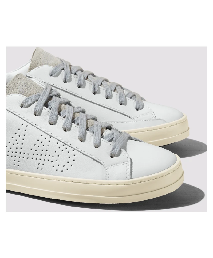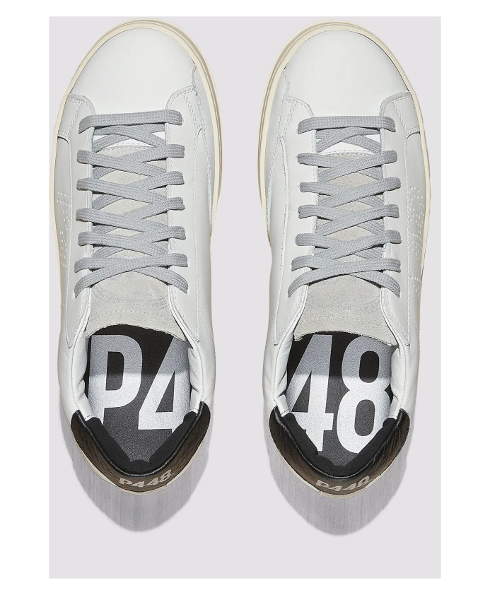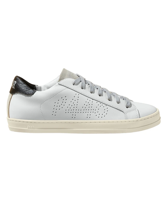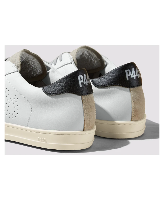 Дополните свой образ кроссовками P448 John White/Black. Белый кожаный верх и бежевый замшевый язычок контрастируют с черной кожаной пяткой и подошвой.