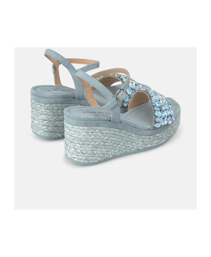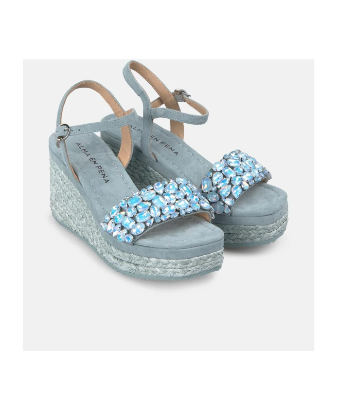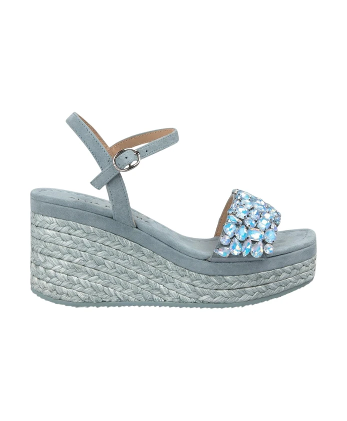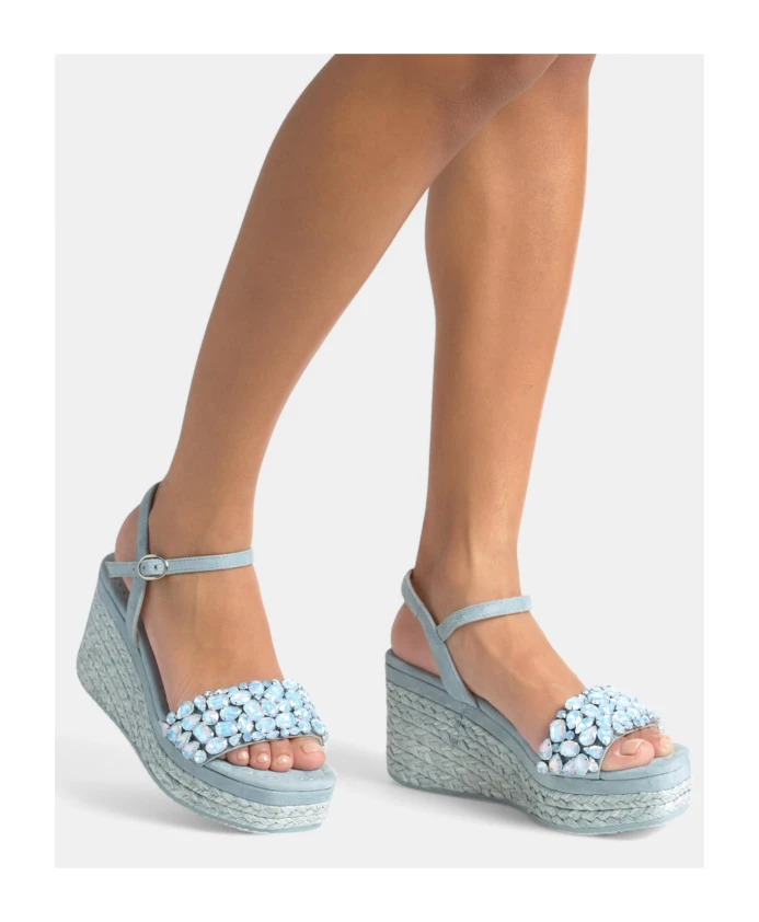 Сандалии на танкетке с ремешком, украшенным стразами, и квадратным носком. Плетеная подошва, декорированная стразами. Пряжка и высота каблука 9,8 см.