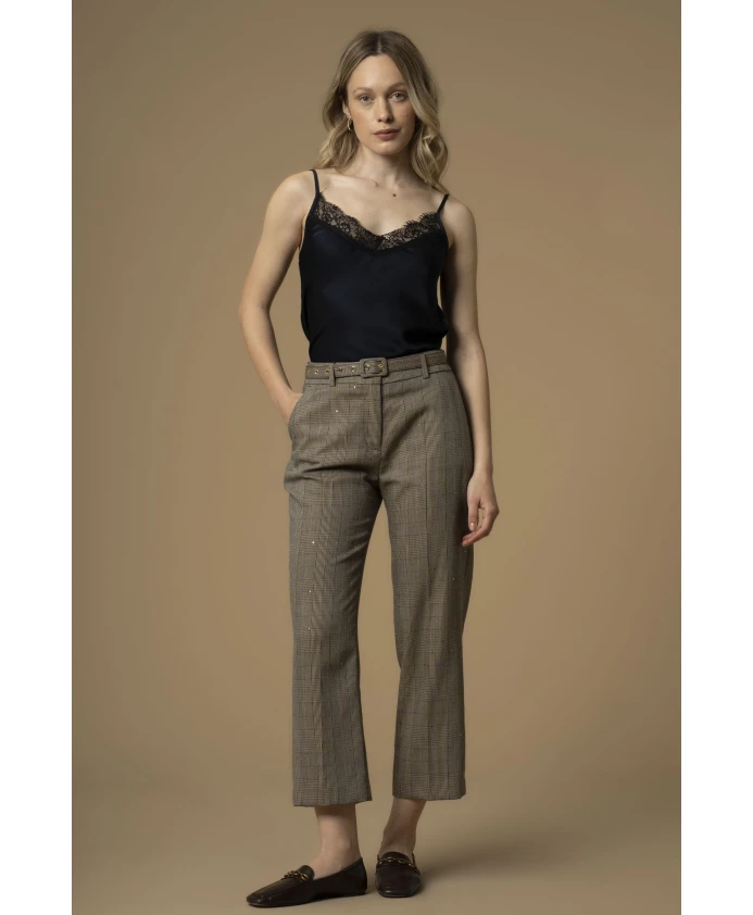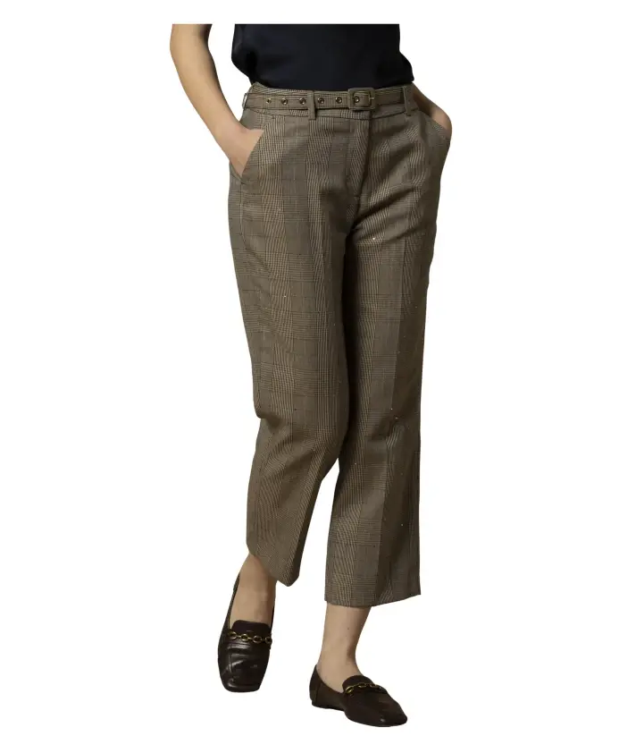 Повседневный шик, брюки три четверти, изящный клетчатый узор, пояс в тон с металлическими окантовками, прямой крой. Рост модели 175 см, размер S/42.