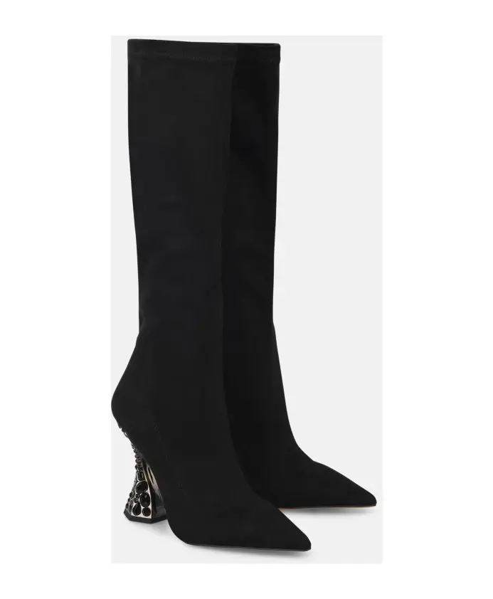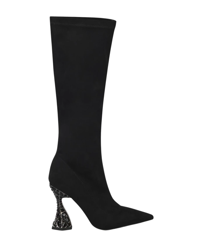 Ботильоны на узком каблуке. Особенности: заостренный носок, широкий каблук и застежка на пряжке. Высота каблука: 11 см, высота голенища: 14 см.