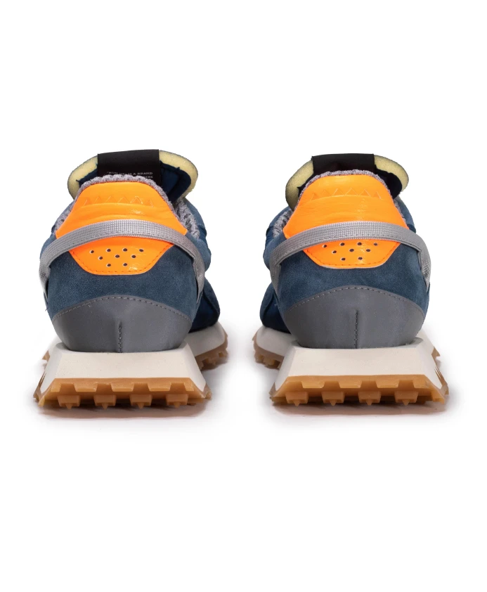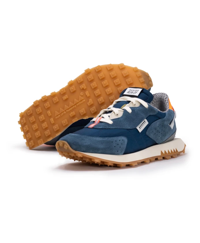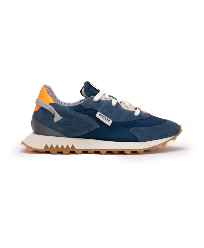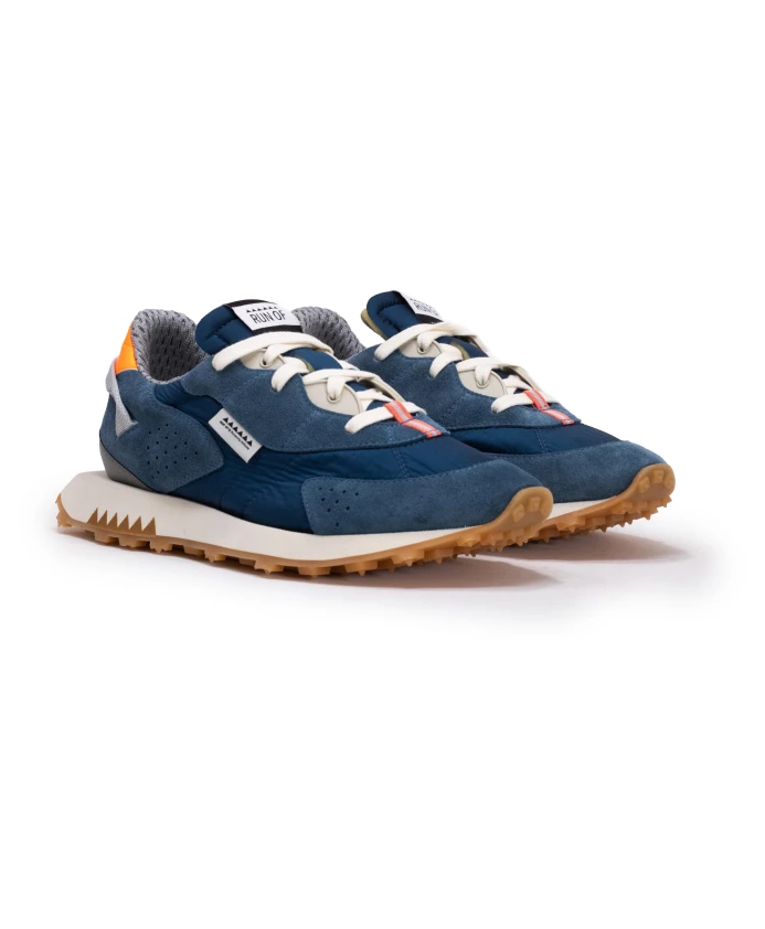 Кроссовки синего цвета, изготовлены из натуральной кожи и синтетического материала. Резиновая подошва белого/медового цвета. Сделано в Италии.