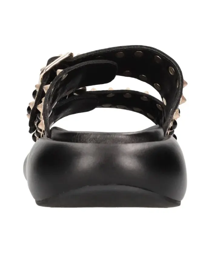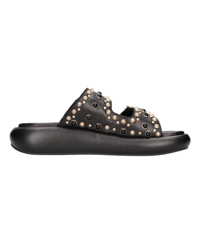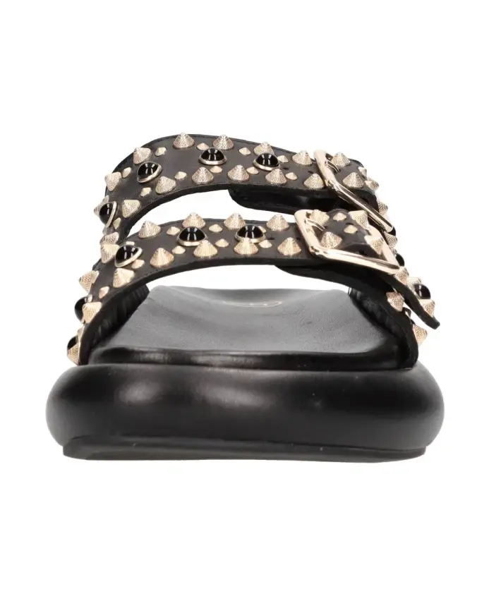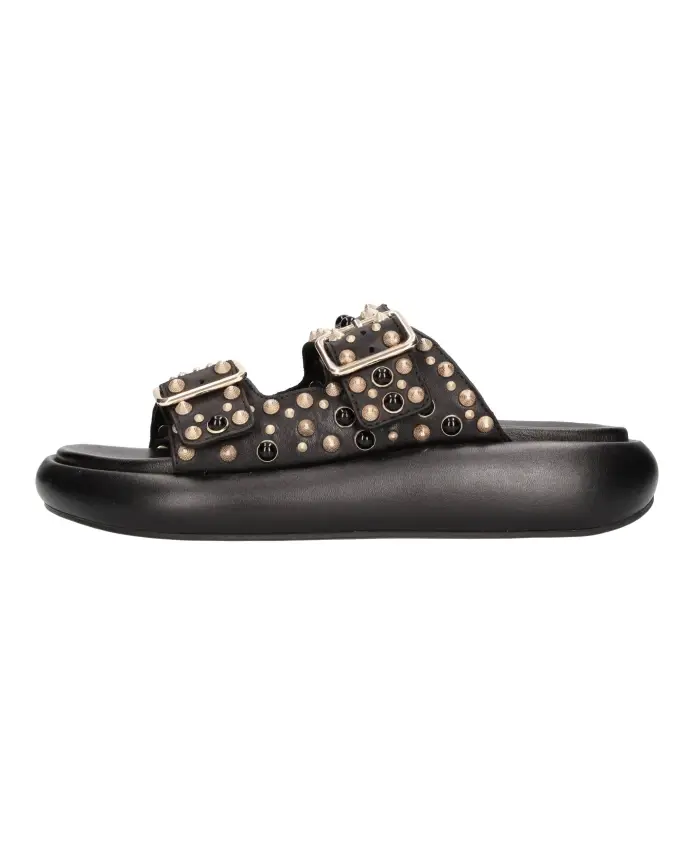 Женские кожаные шлепанцы ASH с медными и черными заклепками. Кожаная стелька с тисненым логотипом. Резиновая подошва с тисненым логотипом.