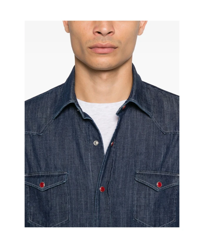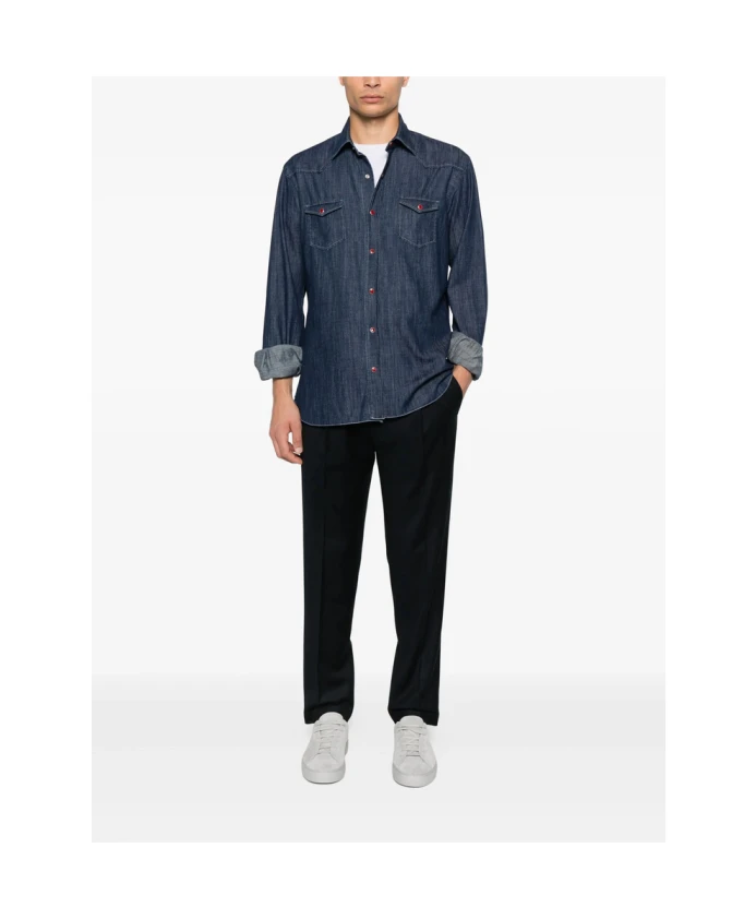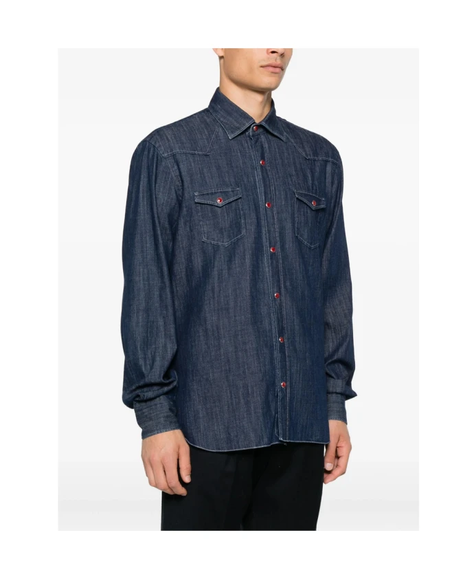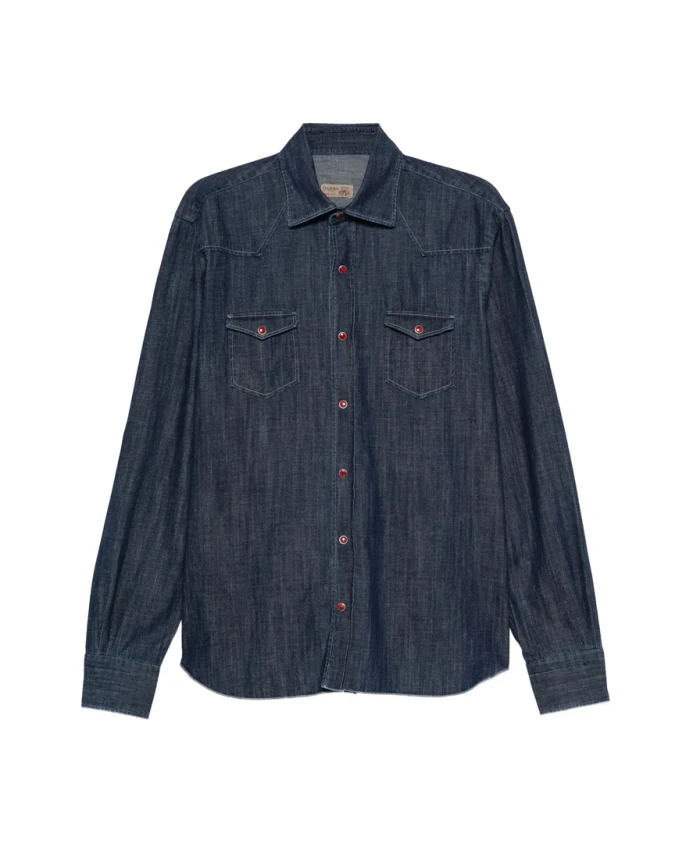 Мужская джинсовая рубашка Barba синего цвета с застежкой на пуговицы, нагрудными карманами, заостренным воротником и красными пуговицами.