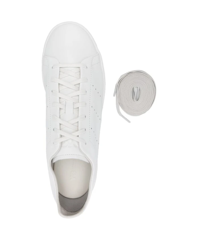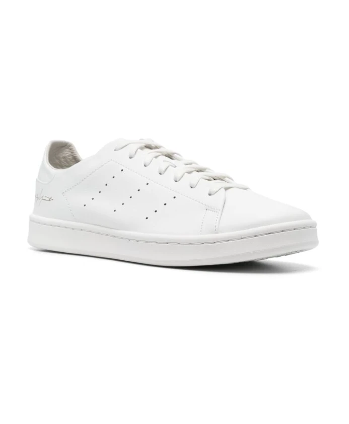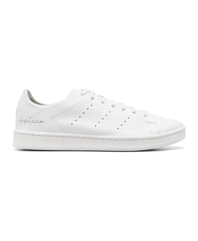 Белые мужские кроссовки Y-3 с передней шнуровкой, язычком с тисненым логотипом, перфорированными деталями и плоской резиновой подошвой.