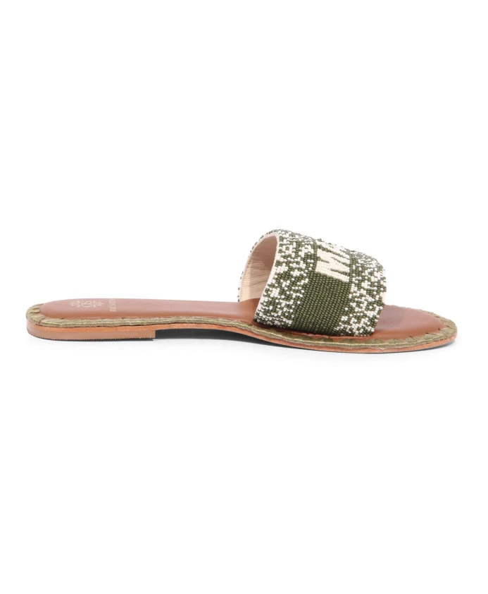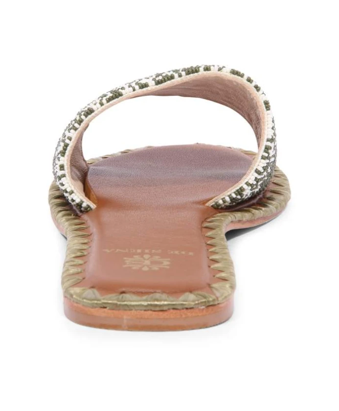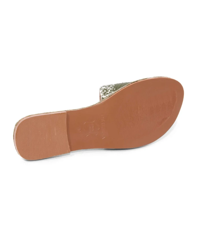 Подчеркните свой летний стиль с помощью этих шлепанцев De Siena цвета хаки, украшенных жемчугом Forte dei Marmi. Модель: 28_23 DS 451.