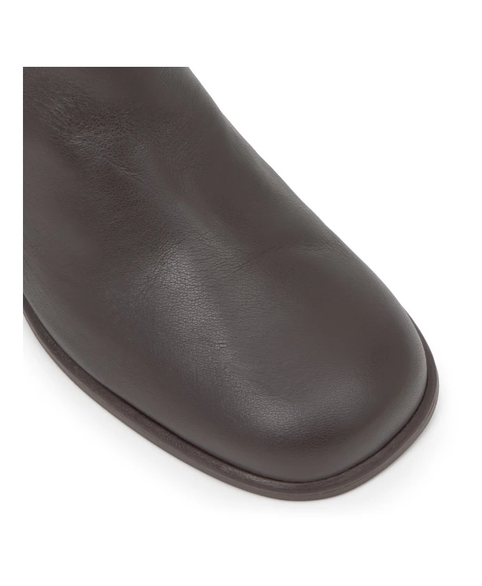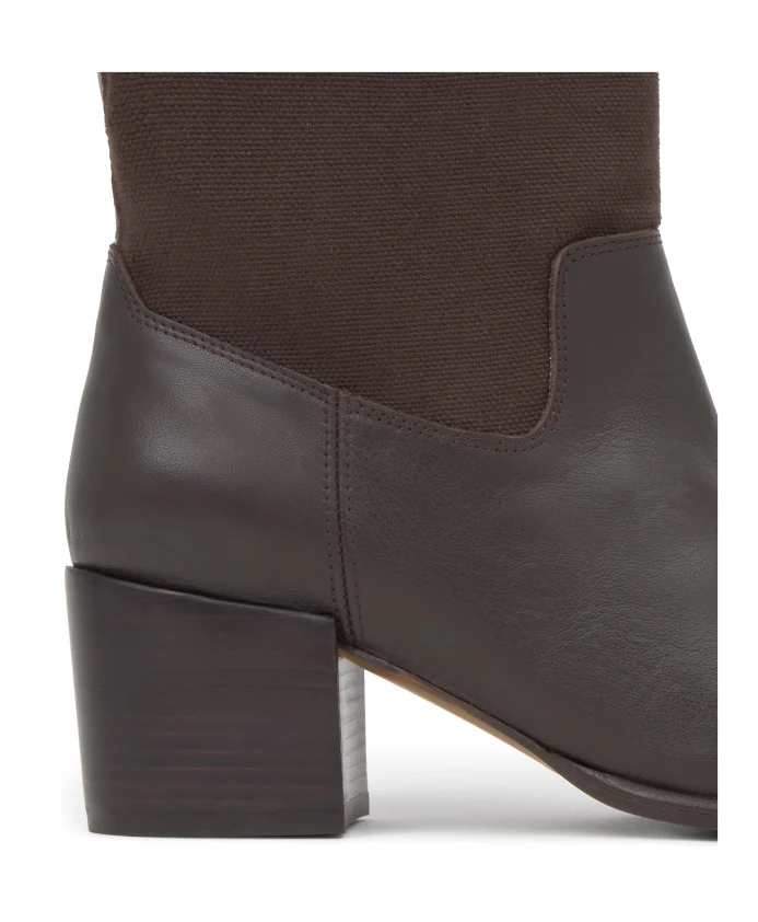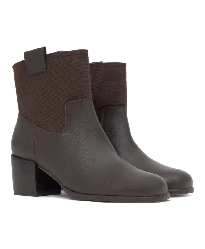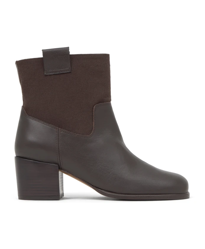 Ботильоны Nona из кожи наппа в сочетании с верхом из хлопкового холста, мягкой стелькой и каблуком высотой 6 см с отделкой под дерево.