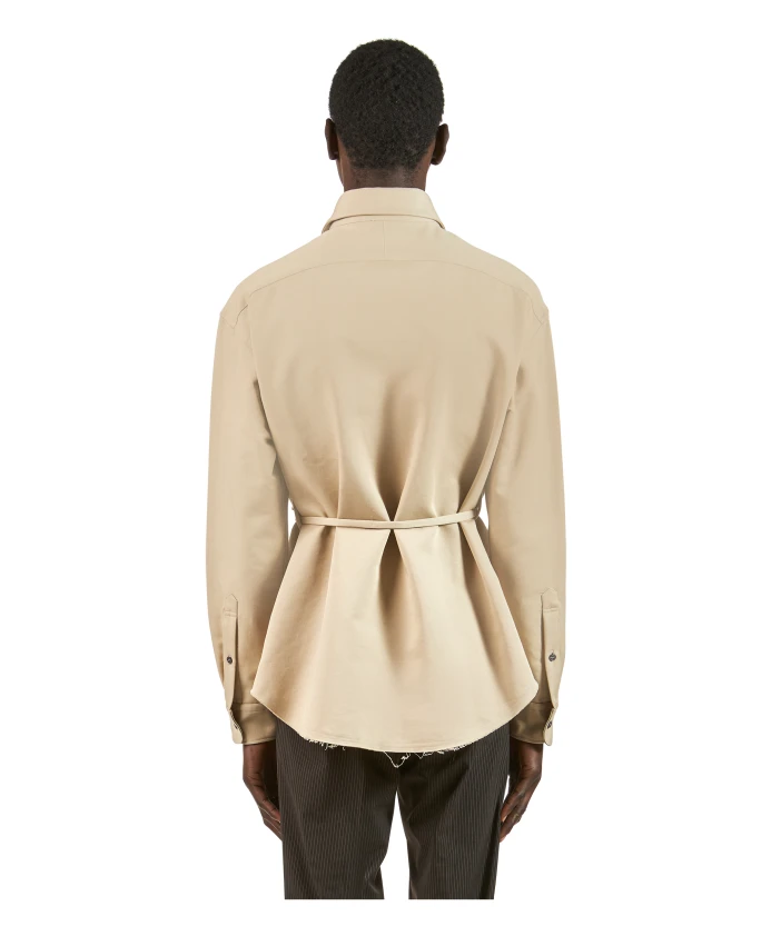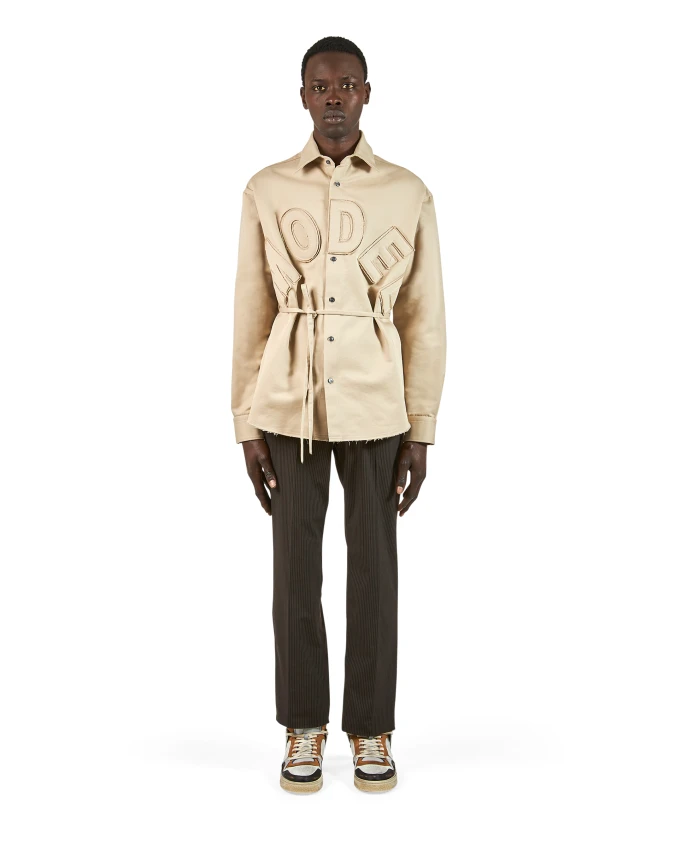 Рубашка из чистого хлопкового габардина с видимыми пуговицами и объемной макронадписью на передней части. С тканевым поясом на талии.