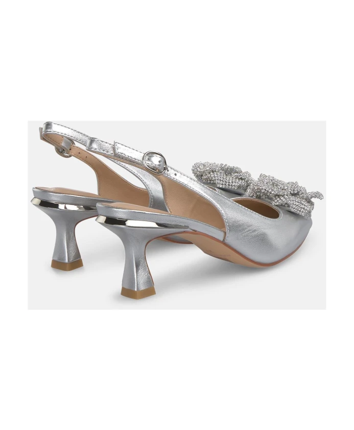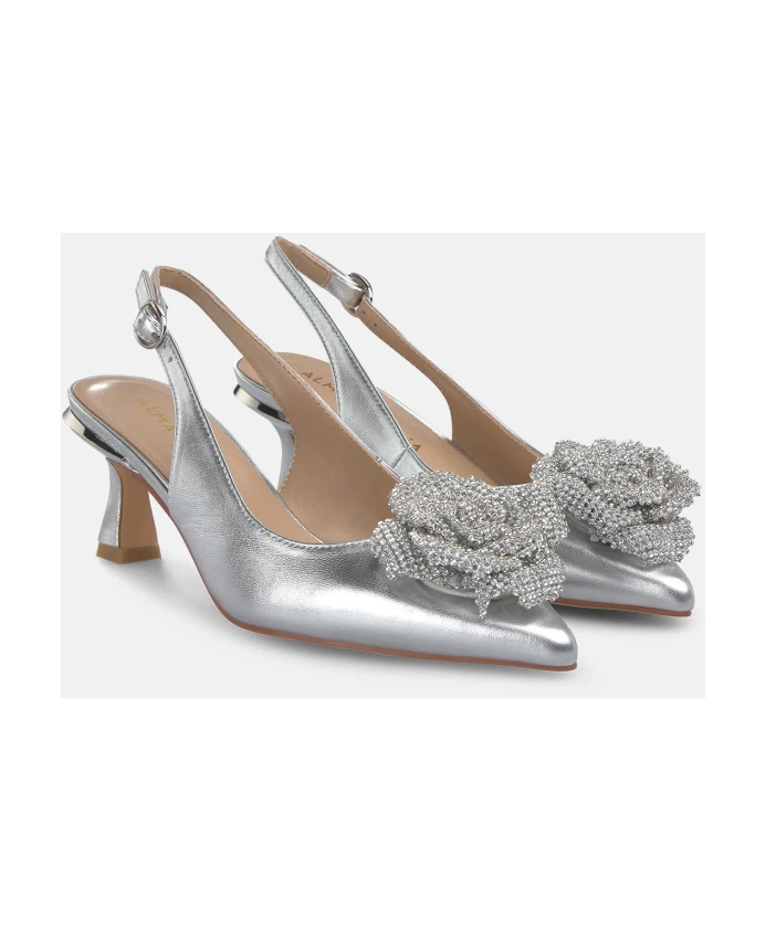 Женские мини-туфли на каблуке с открытой пяткой. Заостренный носок, цветочный декор и застежка на пряжке. Высота каблука: 6,2 см.