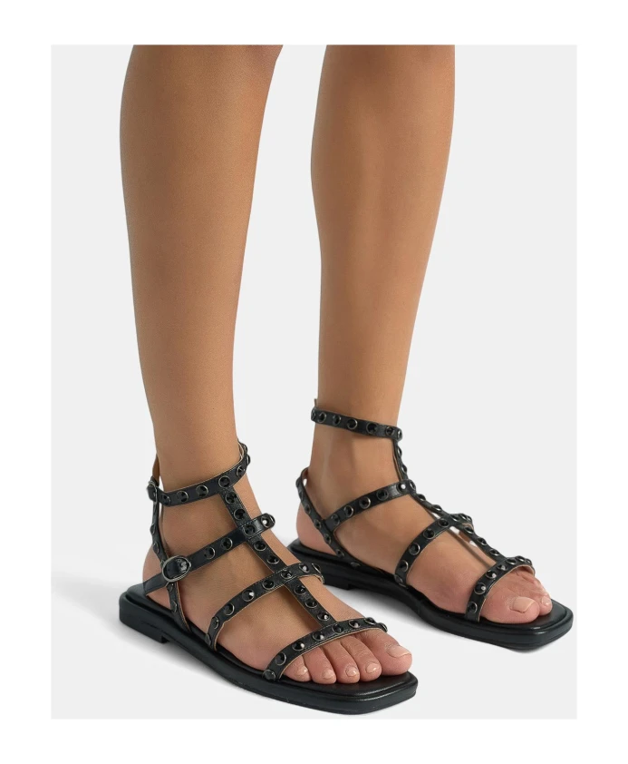 Сандалии в греческом стиле на плоской подошве с пряжками и заклепками, квадратный носок. Застежка на пряжку, высота каблука 1 см.