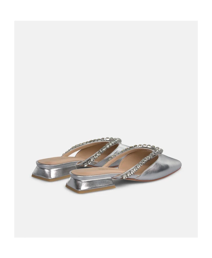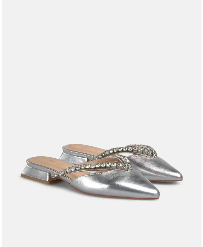 Туфли на плоской подошве с заостренным носком и полосой из страз на подъеме. Изготовлены из кожи, без застежки, на каблуке 2 см.