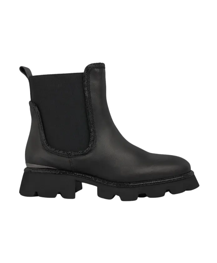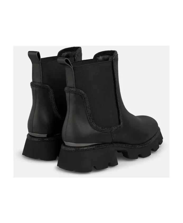 Женские ботильоны с отделкой стразами. Закругленный носок, модель без застежек. Высота каблука: 4,6 см, высота голенища: 16 см.