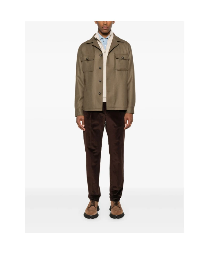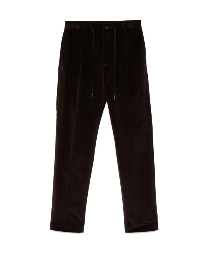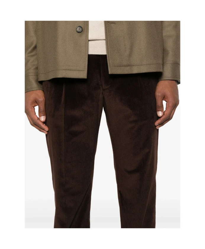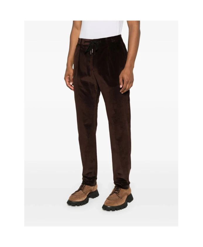 Брюки кофейно-коричневого цвета, потайная застежка спереди, пояс на шнурке, два прорезных кармана сзади, петли для ремня.