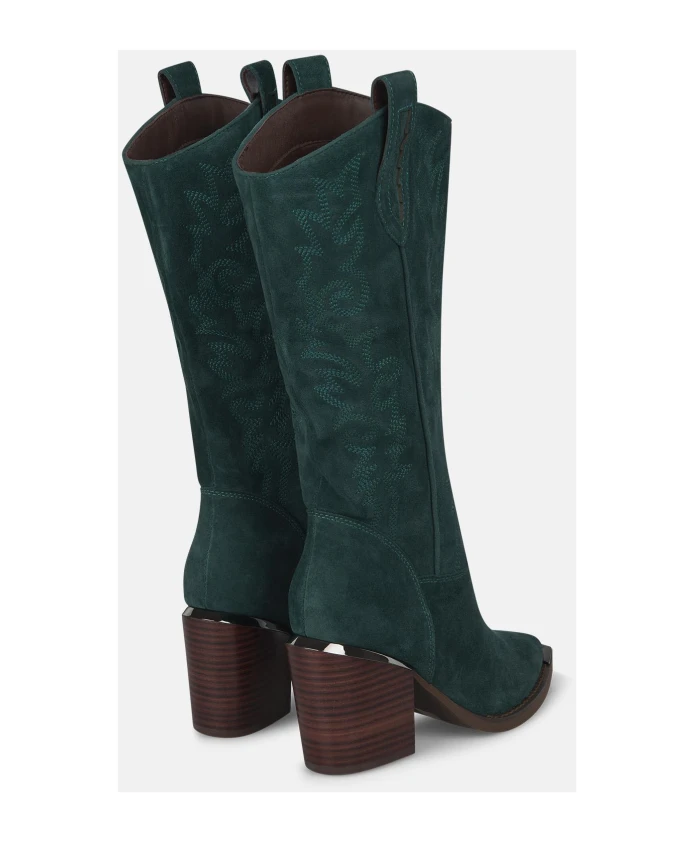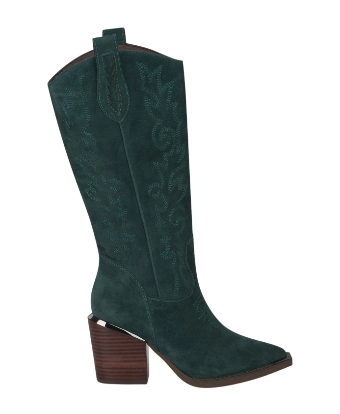 Женские сапоги на каблуке с острым носком и широким каблуком, без застежки. Высота каблука 7 см, высота голенища 19,5 см.