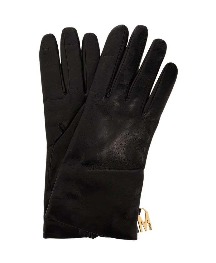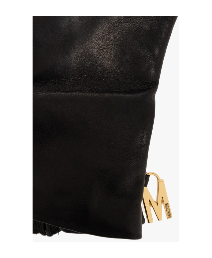 Черные перчатки от Moschino. Эта пара кожаных перчаток украшена металлическим брелоком в виде логотипа золотистого цвета.