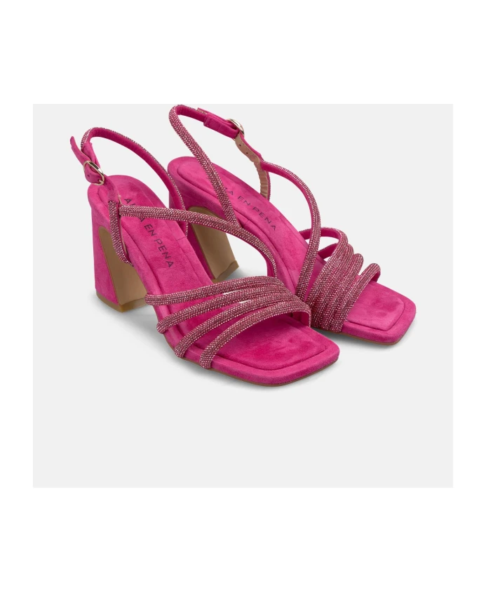 Сандалии на устойчивом каблуке с широким ремешком, украшенным стразами. Квадратный носок. Пряжка и высота каблука 8,5 см.