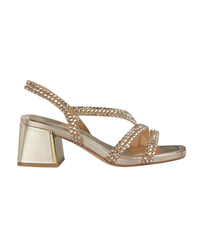 Сандалии на каблуке с перекрещивающимися полосками, украшенными стразами. Квадратный носок. Пряжка и высота каблука 6 см.
