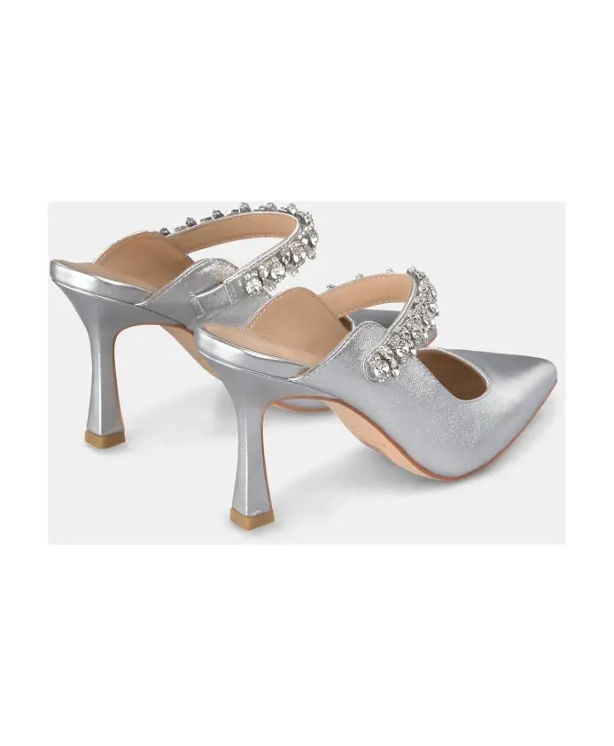 Туфли на высоком каблуке, украшенные стразами. Заостренный носок с металлическими деталями. Пряжка и высота каблука 9 см.