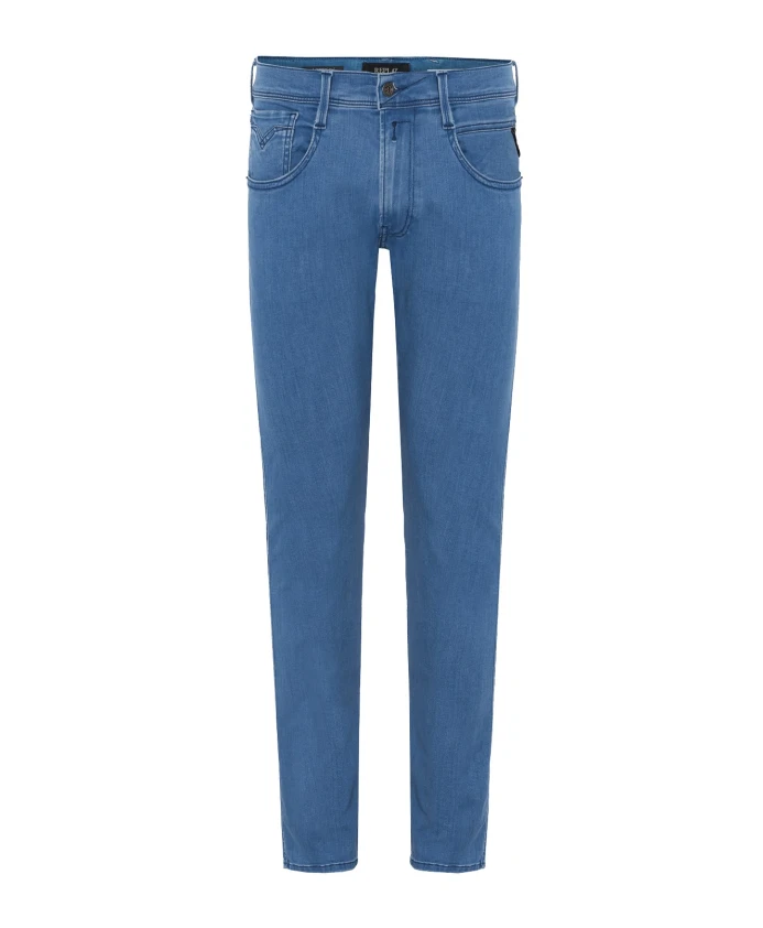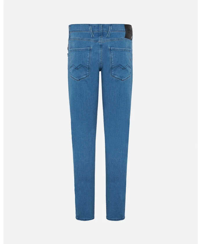 Мужские узкие джинсы Replay синего цвета с эффектом потертости. Состав: 91% хлопок, 6% эластомультиэстер и 3% эластан.